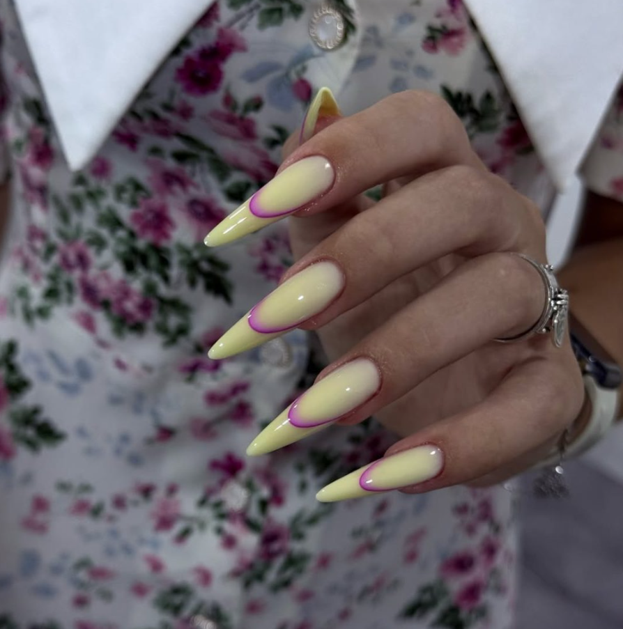 Pastel lemon covers the nail with a slender magenta swoop tracing the tip—sunny but sophisticated. The color pairing brightens hands and looks fresh with floral dresses or denim. Style it: floral midi, denim jacket, silver jewelry. Salon notes: Ask for a thin liner to paint the swoop after curing the base; seal twice for shine.