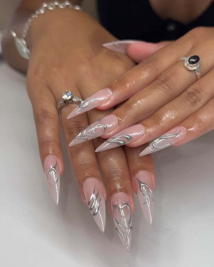 Sheer blush meets mirrored silver linework—flames, hearts, and swoops that read jewelry-like rather than maximalist. The reflective detailing adds depth without heavy color, ideal for statement nails that still feel refined.