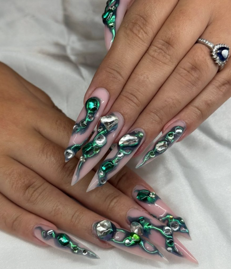 Molten silver and emerald chrome puddles flow along a blush base, forming a sculptural, futuristic texture. It’s jewelry-meets-sci-fi and unabashedly Baddie—made for nights out and festival season. Styling tip: Black slip dress, chrome bag, and one statement ring to match the metallic blobs. Salon notes: Ask for 3D gel raised work painted with green and silver chrome powders; seal with a non-wipe top to protect shine.