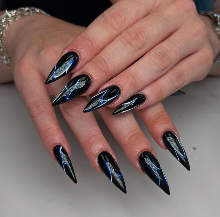 Gloss-black stilettos become tiny canvases for electric blue lines and silver geometrics, like microcircuit boards. Futuristic without losing wearability—perfect for cocktail hours and gallery nights. Style it: a monochrome black look with a cobalt bag to echo the accents. Salon notes: Keep the apex high for durability; use fine stripers for the metallic detail.