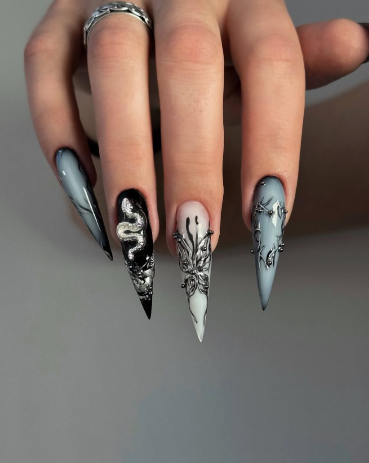 Monochrome nails with a muted color palette, blending into tones of ash with an ombre effect. Achiever nails are capped with a serpent, coiled with chrome florals. Styling tip: To offset the extravagant look, wear a black bodysuit, silver cuff, and pointed flats.