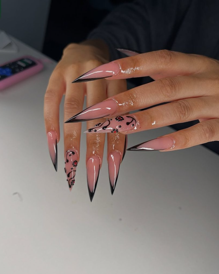 Blush Pink gel is cut by razor-clean, inky French tip peaks. Two accent nails carry hand-painted black vines dotted with tiny crimson blooms, a feminine counterpoint to the sharp silhouette. The mix skews Baddie but stays office-friendly thanks to the neutral base. Style it: Black satin cami, cropped cardigan, slingbacks. Salon notes: Ask for a glassy topcoat over the art to keep the micro florals crisp.