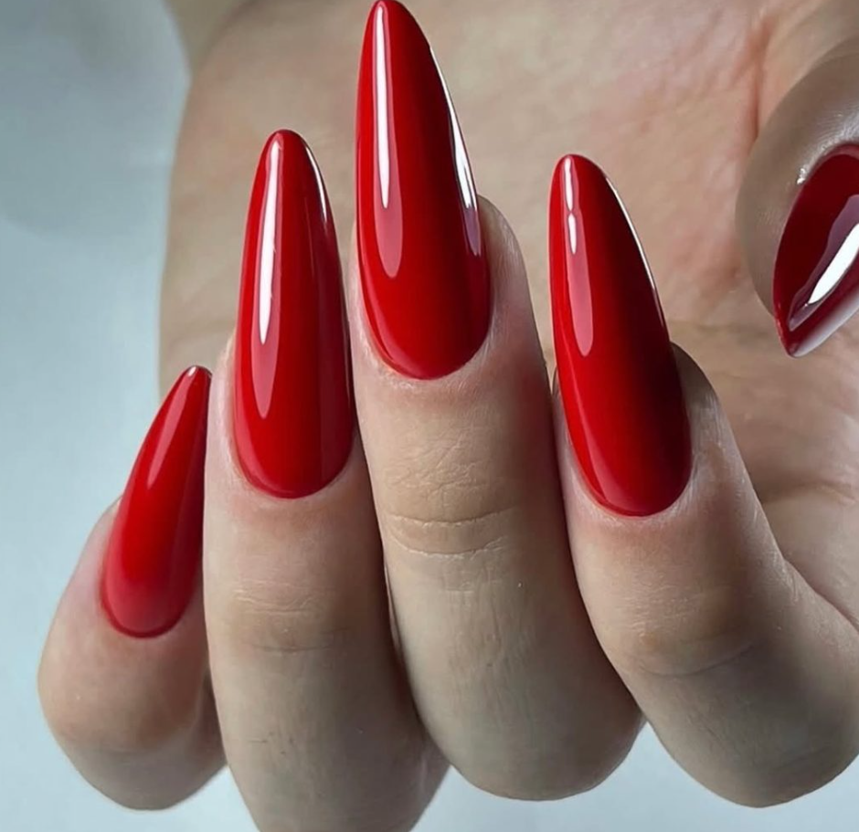High-gloss, blue-based Red on a tapered stiletto is the definition of confident polish. Minimal effort, maximum presence—no nail art required.