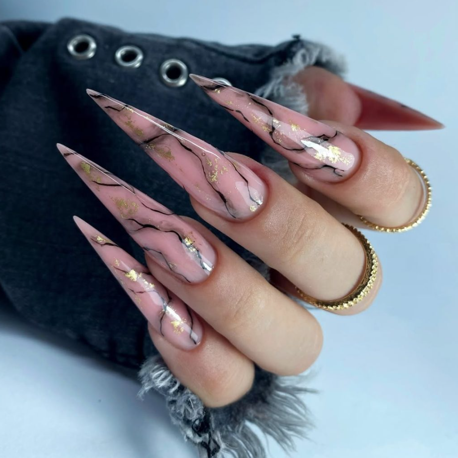 Dusty Pink jelly is veined with inky lines and scattered with gold foil for a luxe, stone-inspired look. The elongated shape keeps it editorial, while the palette stays everyday-wearable. Styling tip: Gray wool coat, cream knit, gold signet rings—let the foil be your jewelry. Salon notes: Ask for ultra-thin veining with a liner brush and a cushiony builder apex to protect the sharp points.