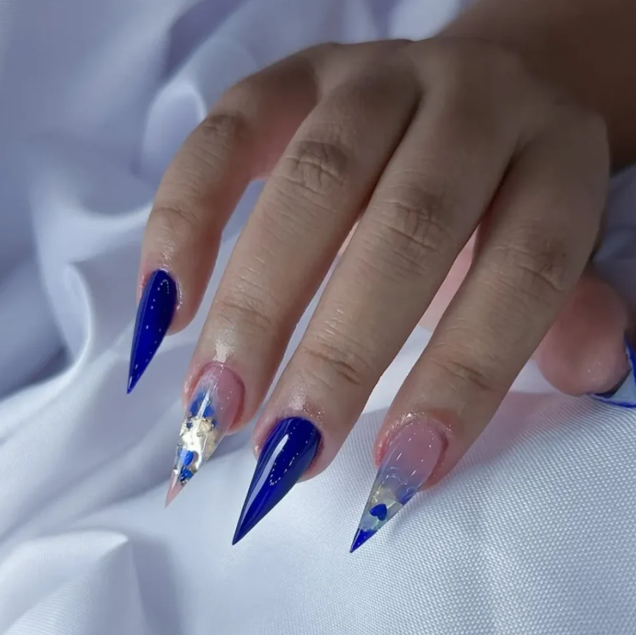 The vibrant royal blue along with the transparent jelly-clear tips flecked with soft shapes playfully mixes light, making it perfect for a sunny weekend or a beach escape. The negative space elongated the hand without adding extra length. Styling tip: Crisp white button-down, light-wash jeans, and metallic sandals for a perfect look.