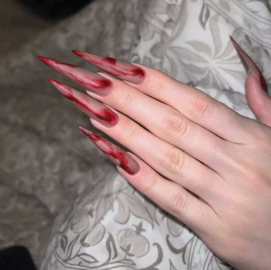 A nude base veiled with wine-red, smoky veining—think marble but moodier. It’s the grown-up way to wear red without going full lacquer, and it leans subtly goth while staying refined.