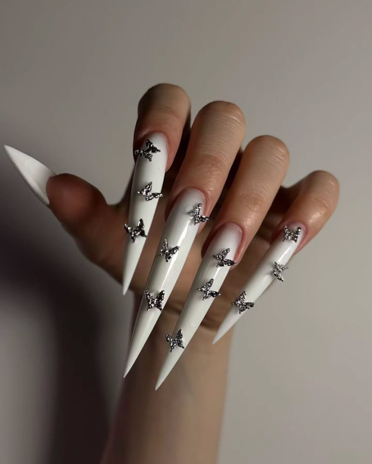 Creamy white stilettos studded with 3D butterfly charms read couture but not kitsch. The charms add instant jewelry energy; keep the rest of the look streamlined so the nails lead.