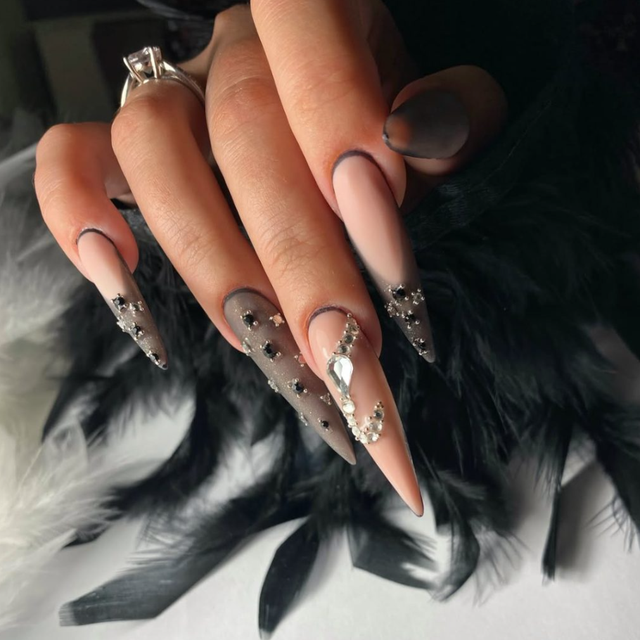 A satin-matte nude flows into smoked charcoal points, peppered with glossy jet studs and a winding crystal S-curve on the ring finger. The mix of soft base and armored accents lands right between elegant and baddie—strong, but still wearable for the workweek.