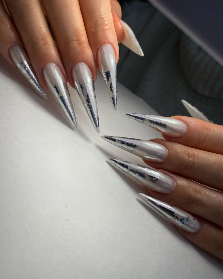 Moonlit pearl gel meets jagged silver leaf that streaks toward each point like a comet tail. The metallic accents catch elevators, office lighting, and flash photos—equal parts office-appropriate and cocktail-ready.