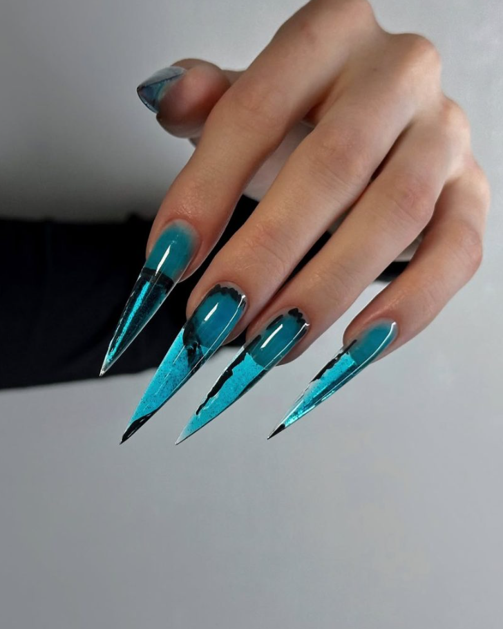 Aquatic jelly tips with inky fractures give underwater geode energy—bold without feeling heavy. The translucent layers make the nails look impossibly long and light.