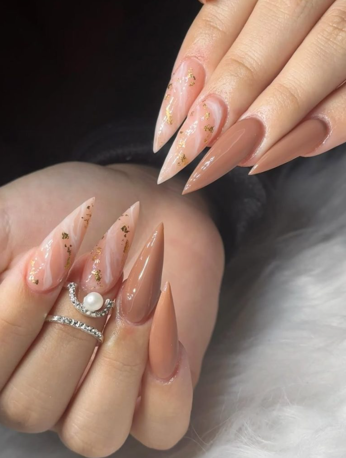 A creamy nude meets swirls of soft pink marble kissed with gold leaf, balanced by solid toffee nails for a modern neutral set. The mixed finishes feel curated—like stacking matte and glossy bangles. Styling tip: Beige trench, white tee, straight-leg denim; add a pearl stud to mirror the gold flecks. Salon notes: Request translucent pink marble veining and micro leaf pieces pressed flat before topcoat.