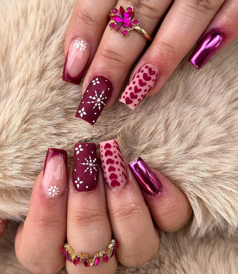 Matte snowflake designs and dainty heart patterns add a playful yet elegant touch, balancing cozy warmth with festive glam.