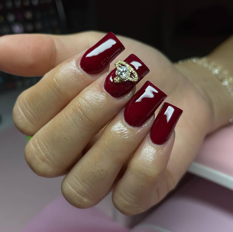 Rich, glossy burgundy nails radiate timeless elegance with a high-shine finish that catches every glimmer of light.