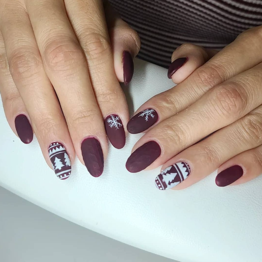 Soft matte burgundy nails meet charming Nordic-inspired patterns in this cozy winter look.