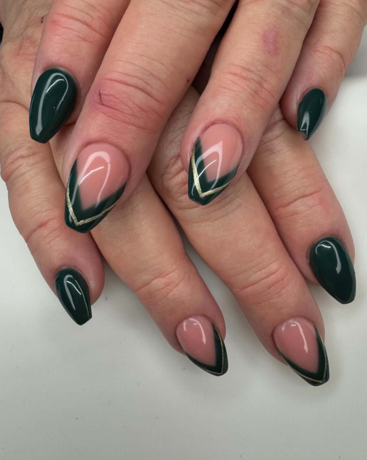 The design balances glossy green polish with glittery accents, giving the nails a radiant depth perfect for the cold season.