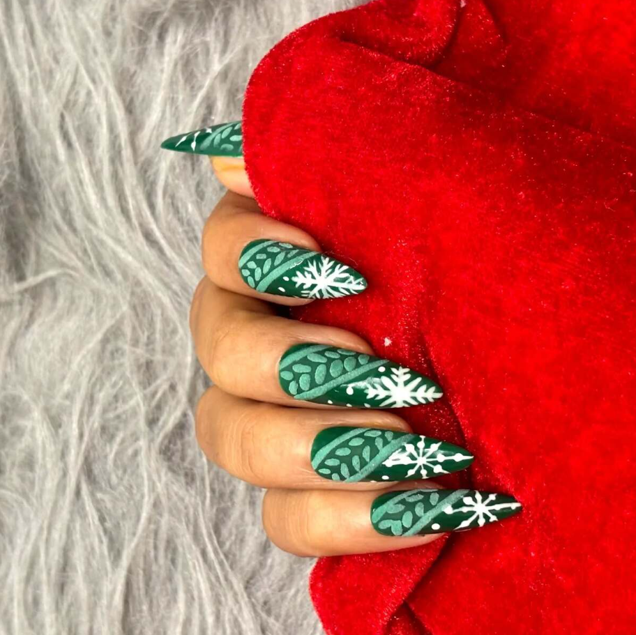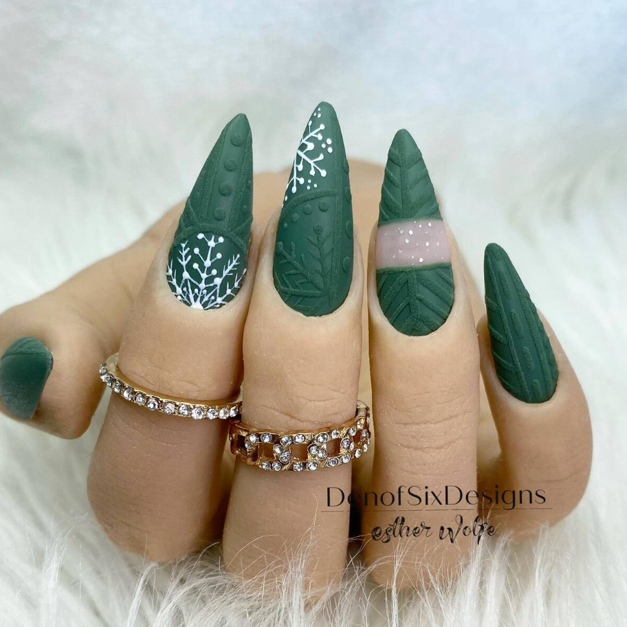 Matte forest green nails bring cozy charm with intricate knit textures and delicate white snowflakes.