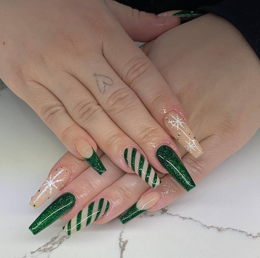Shimmering forest green nails mix festive sparkle with playful winter patterns.