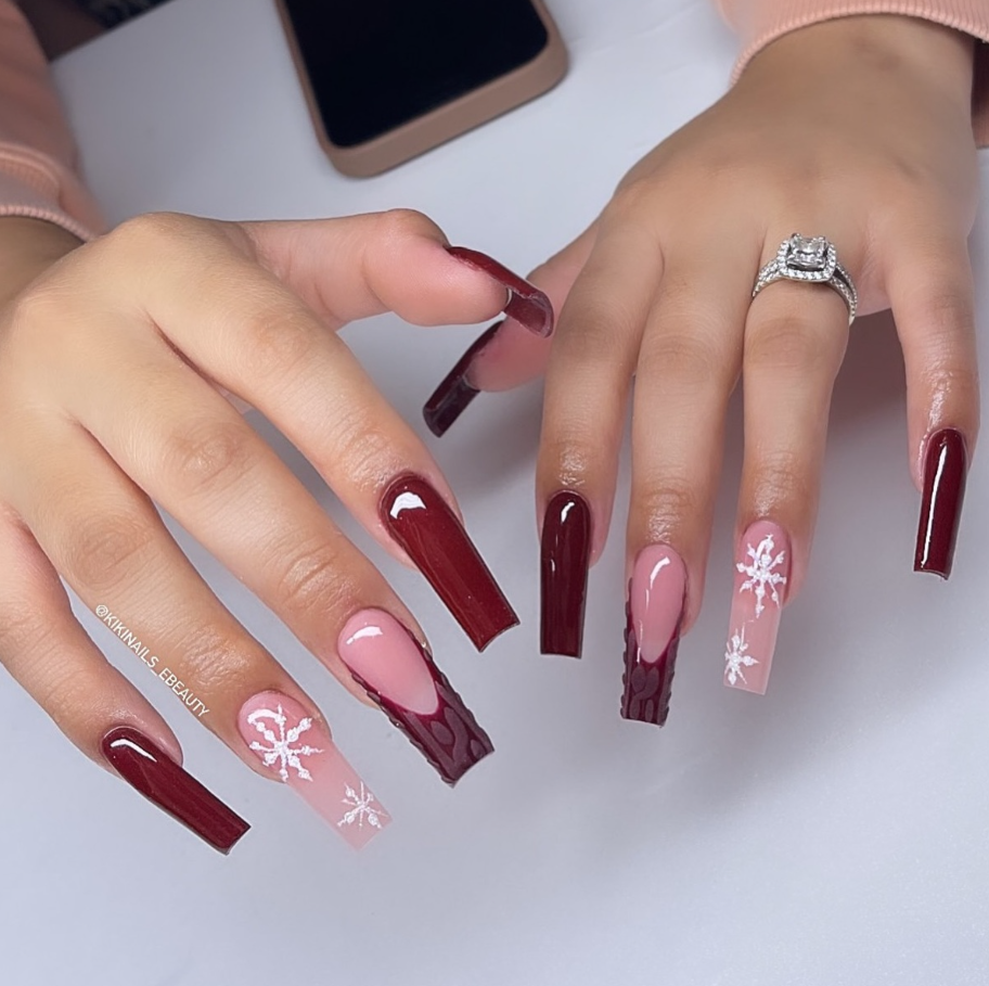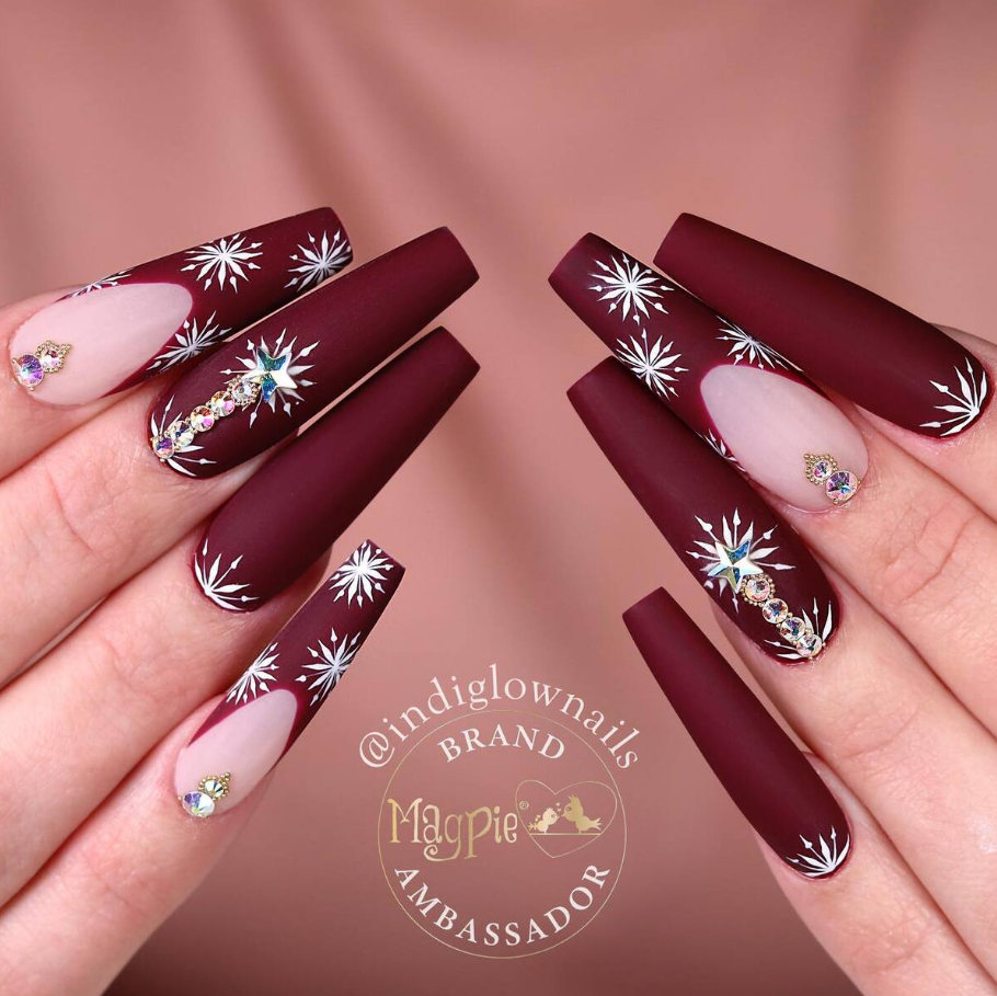 14. Glossy Burgundy Elegance with Snowflake Accents
