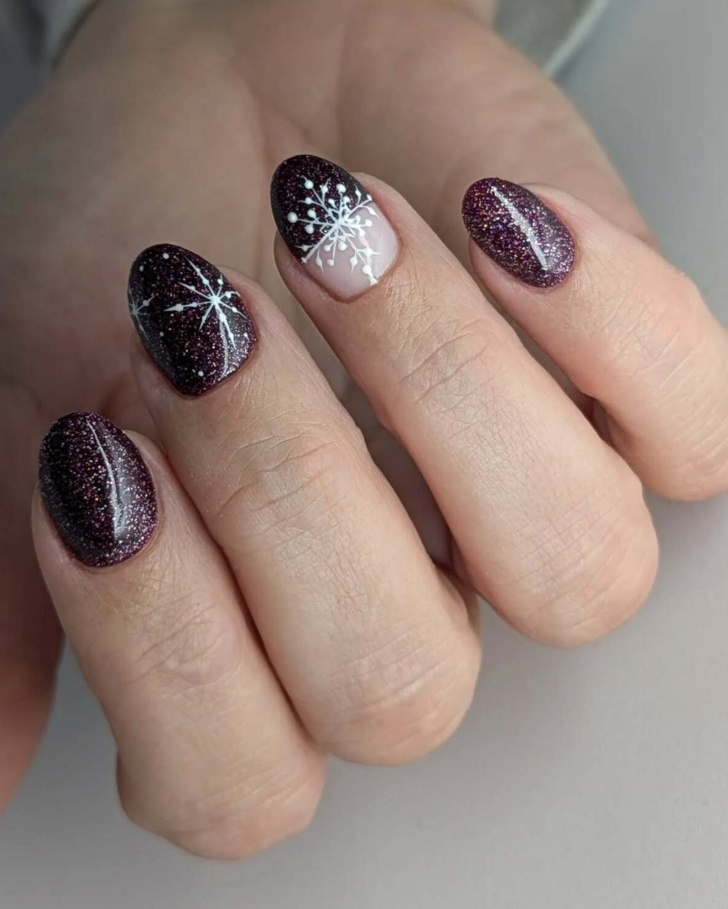 Elegant white snowflake accents on select nails bring a touch of frosty magic, beautifully contrasting the dark base.