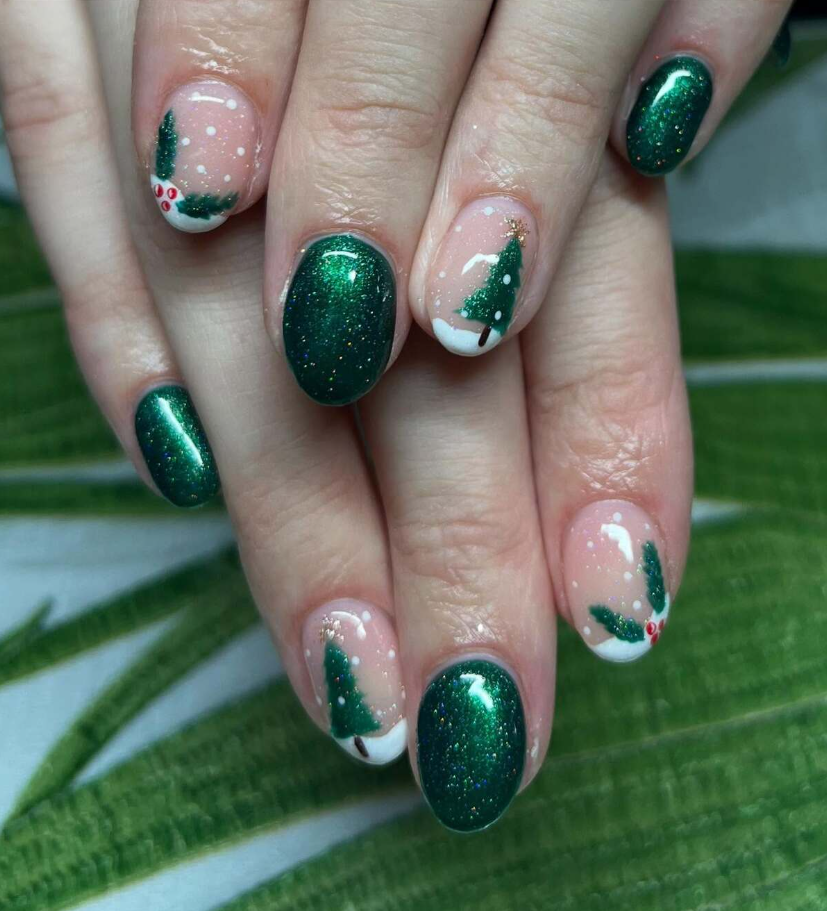 Glittery emerald nails capture the magic of a winter wonderland, paired with charming Christmas tree and holly accents.