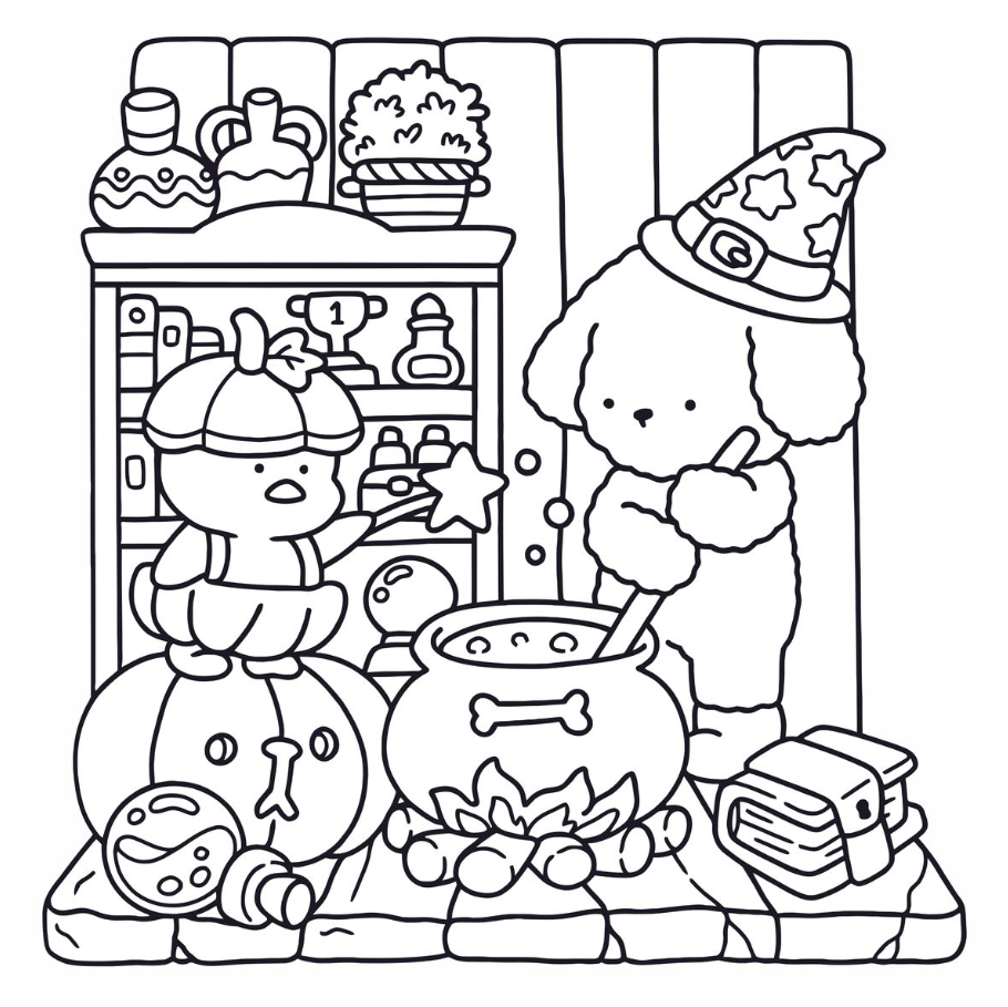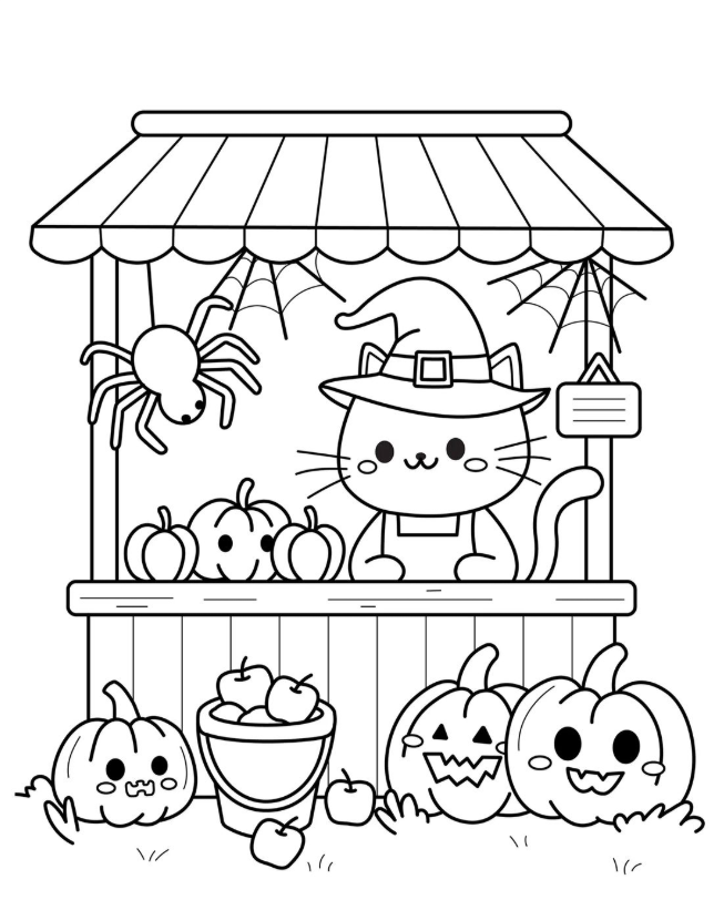 A kawaii cat in a witch hat runs an adorable pumpkin stand, complete with jack-o-lanterns, a basket of apples, and spooky spiders. Download this free Halloween coloring page for spooky season from Yay! Coloring Pages. Every printable is perfect for kids and adults who like to color.