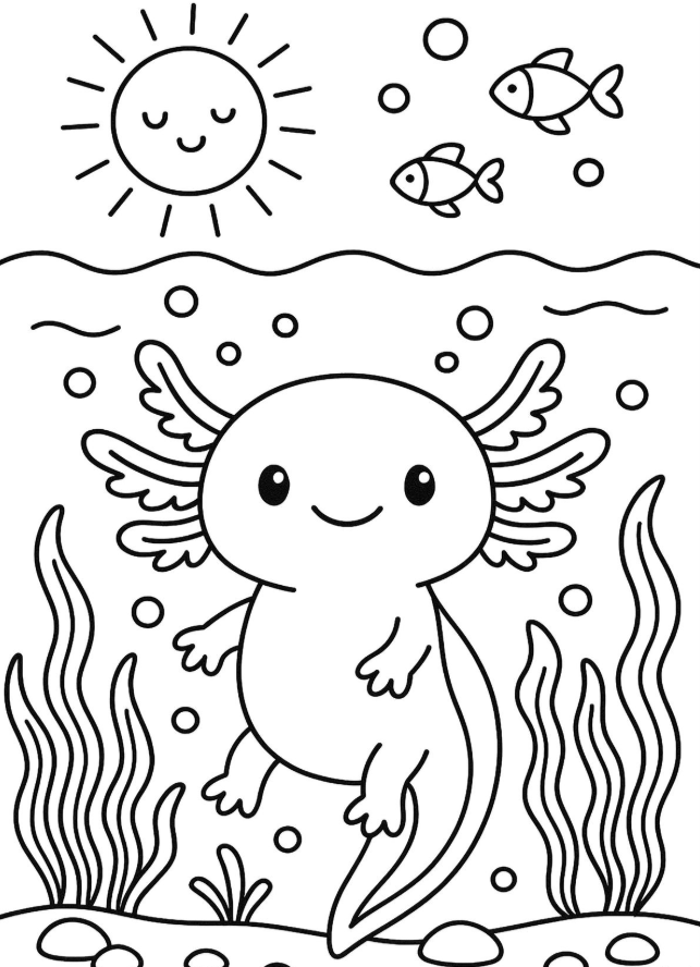 Underwater adventure with a cute axolotl An adorable axolotl floats happily amid bubbles and fish, accompanied by bushy aquatic plants.