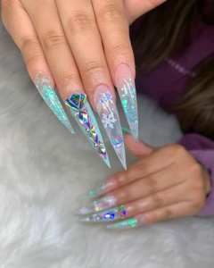 These frosty winter stiletto nails bring an unmistakable touch of luxury to your fingertips. Adorned with shimmering glitter accents and radiant rhinestones, each design captures