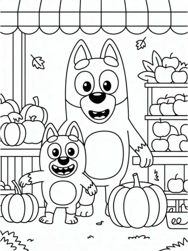 Bring in all the fall charm with pumpkins, acorns, and leaves around Bluey. I love borders with tiny details mixed with big shapes in the middle. It gives my older two a challenge, and still lets my littlest fill in broad areas. The balance keeps everyone happy.