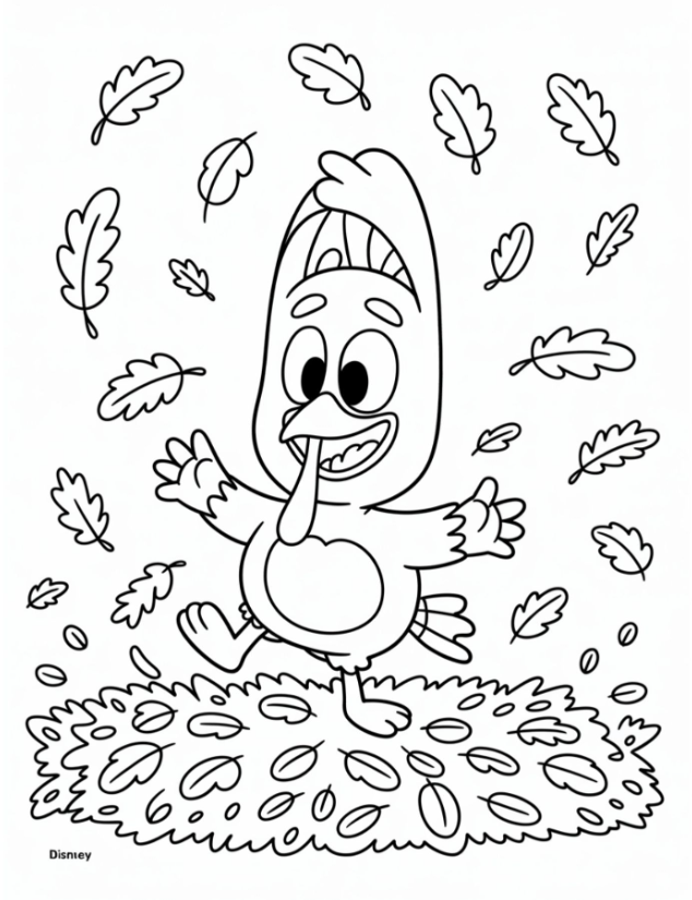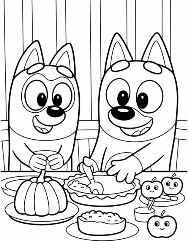 My kids light up when Bingo or Bandit shows up on the page. Character-themed sheets feel familiar and playful. Think Bluey carrying a tiny pie, Bingo with a fall scarf, or the whole Heelers sitting at a small table. It’s cute, it’s cozy, and it instantly feels like Thanksgiving.