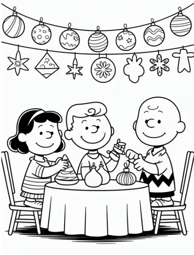 Holiday scenes make kids feel the season right away. A page with Charlie Brown holding a plate, Snoopy nearby, and Woodstock peeking around the corner is always a hit. The mix of big shapes and small details keeps them busy, yet it stays friendly and easy. You can hear the quiet focus set in, which feels like a gift.
