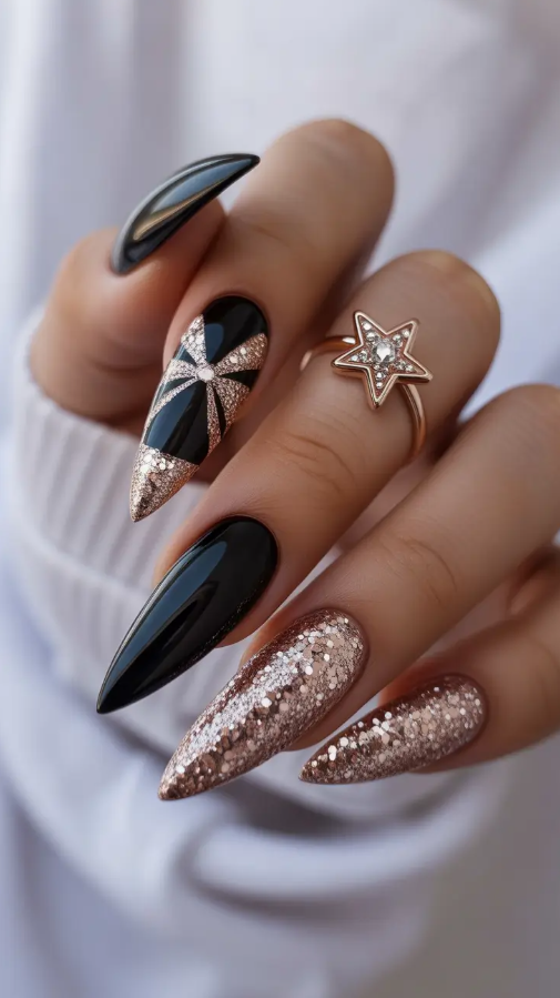 Dark does not mean it is boring- and this black-and-rose-gold combination is a testament to this. It is daring, shiny and evening light. The differences between the glossy black and shimmering metallic textures at once provide that posh, party-season feel. It is my favorite with the light-playing-around-with-it-goes – you think it is a little disco game on your fingertips with every motion of it.