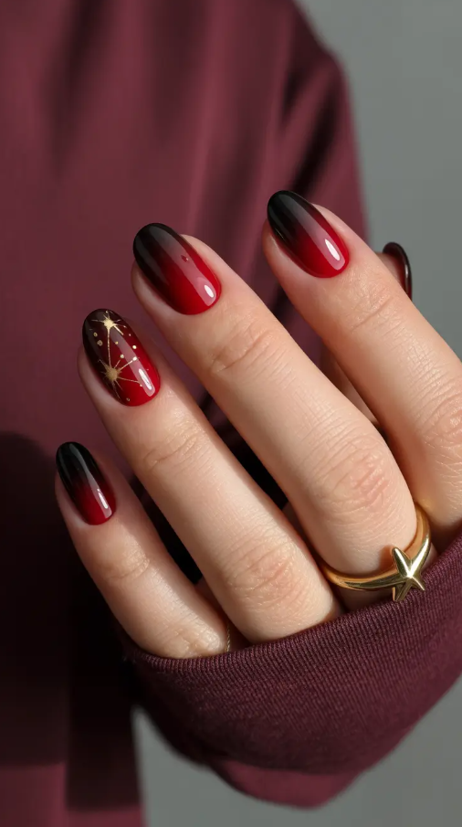 It is hypnotic how the burgundy is transitioning to the black color – it is like the winter night sky right before the snow. This fogulike polish is a combination of the two richest colors of the season and the ideal sultry-meets-sophisticated mix. The gentle starburst of gold is a perfect touch of the sparkle, not too mysterious and at the same time warm. It is one of those glances that appear to be plain, but all the details are not accidental.