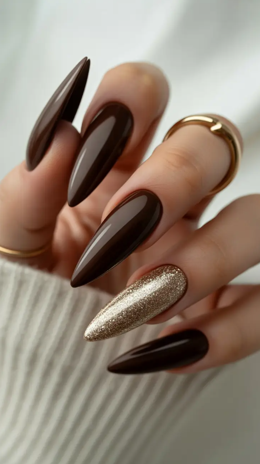 It is hard to disagree that dark chocolate nails are undeniably cool. They are cozy, elegant and complimentary to all skin tones. This is a design that combines glossy cocoa and one golden statement nail, which gives an easy balance in the cozy and the luxe. It is kind of a manicure alternative to hot cocoa in a silk blouse.