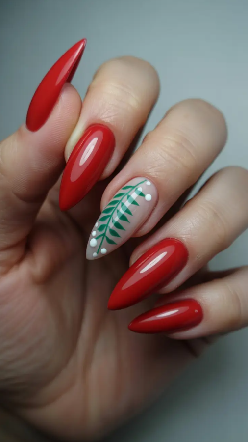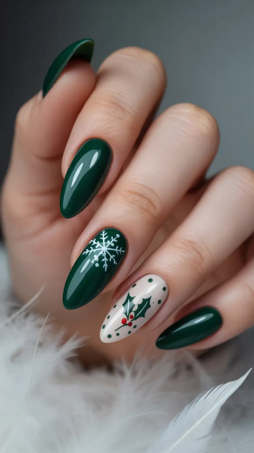 A deep green manicure with the dressing up around the holidays is the spirit of winter. It is a combination of all the best of the season snowflakes, holly, and that home-cooked Christmas atmosphere. The glossy green shade is very elegant, whereas even the accent nails painted with the fine art elements are accompanied only with pure holiday delight. It is light hearted, elegant, and suited to the December parties.