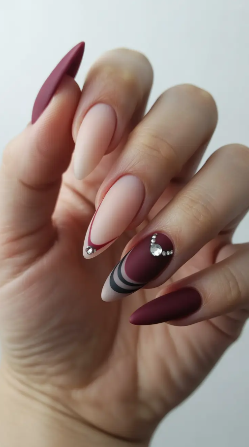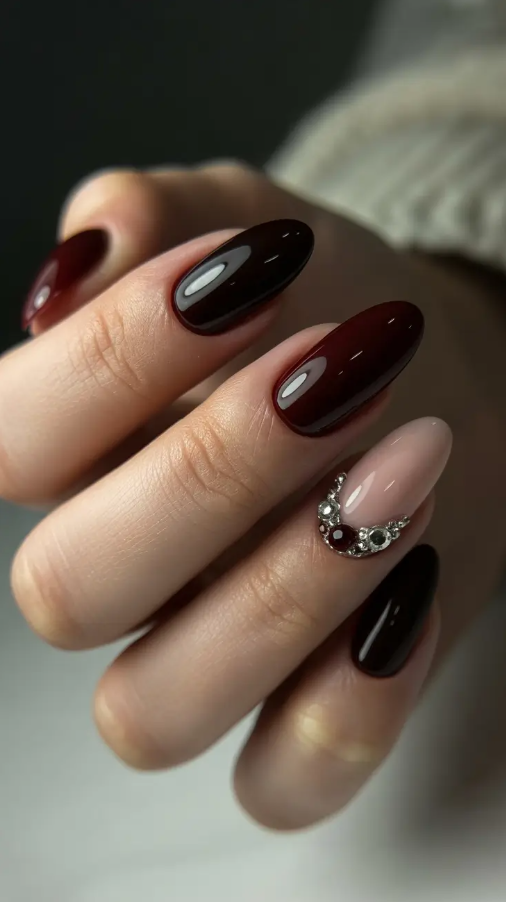 Dark red color has always been whispering confidence, but the trend of this year gave it a more romantic cover. The rich, high-gloss burgundy and a single nude accent, with tiny gemstones on it, is classic but modern. Its shape is oval, which makes it soft, and the touch jeweled suggests glamour.