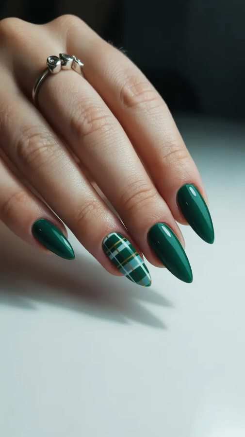 The yellow forest green immediately reminds of soft velvet blazers and sparkling evening lights. I have never thought of deep green nails without thinking of some minor luxury, discreet but inescapable. In this case glossy almond shape is chosen in harmony with one accent plaid which makes the whole look more refined and, at the same time, a bit more playful. It is a traditional winter style in nail art form: it is such a warm, personalized, and sophisticated style.