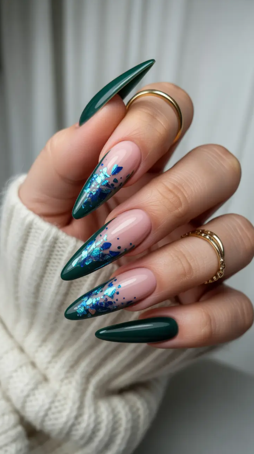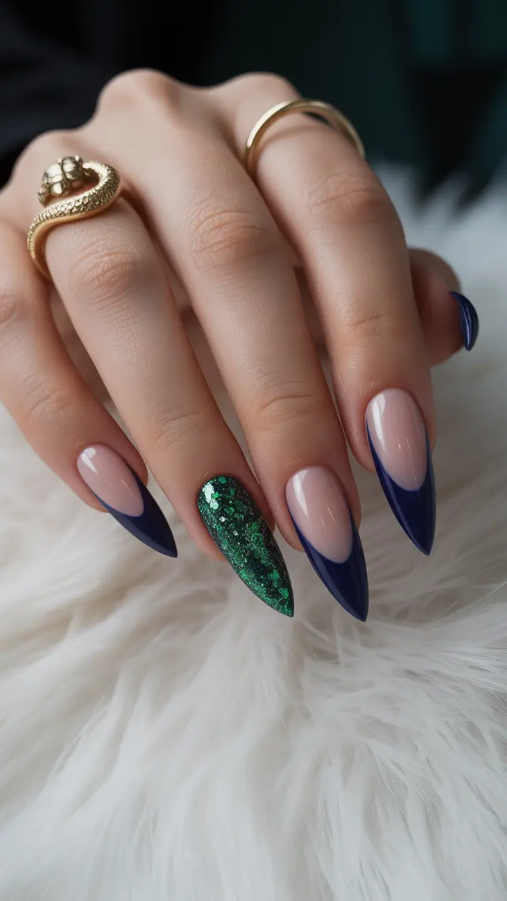 7. Midnight Blue French with Emerald Sparkle