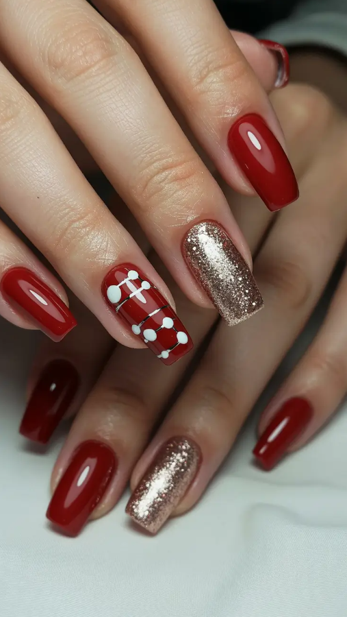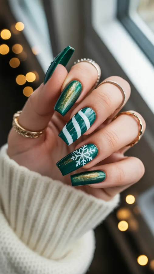 This would be the deep green festive version. Emerald glitter and snowy white and golden glimmer – it is ten seasons in ten perfect fingertips. The fine snowflake accent makes it a bit playful but classy, whereas that metallic line adds the amount of glamour to catch the candlelights or a glow in the city.
