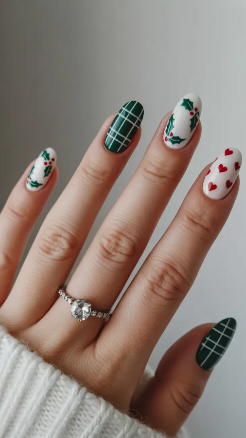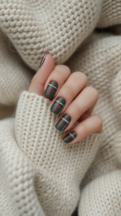 There is nothing as close to cozy chic as a manicure of matte green plaid. It is creating fireplace vibe, cozy sweaters, and your favorite peppermint latte. Such a design is eternal, but completely up-to-date – the deep forest base is contrasted with pure red and white lines in the background. It is one of those nail designs that immediately remind you about a snowy weekend vacation.