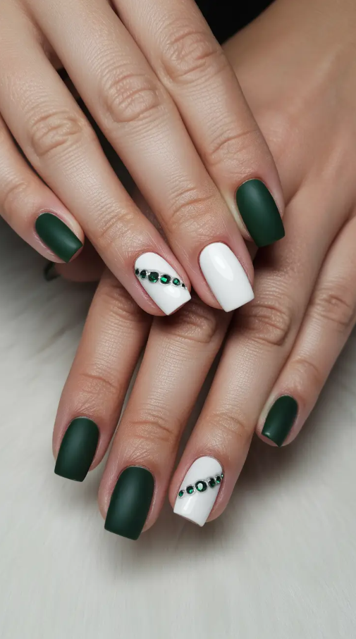 Matte finishes are again in their heyday and this match of emerald and white justifies this. Something about a flat texture adjacent to glossy rhinestones is inherently sophisticated, it is bold and minimal. Squeezing the hands is very clean and balanced due to the squared shape and the crystal line is a good add to the design that gives it the required twinkle during the holiday season.