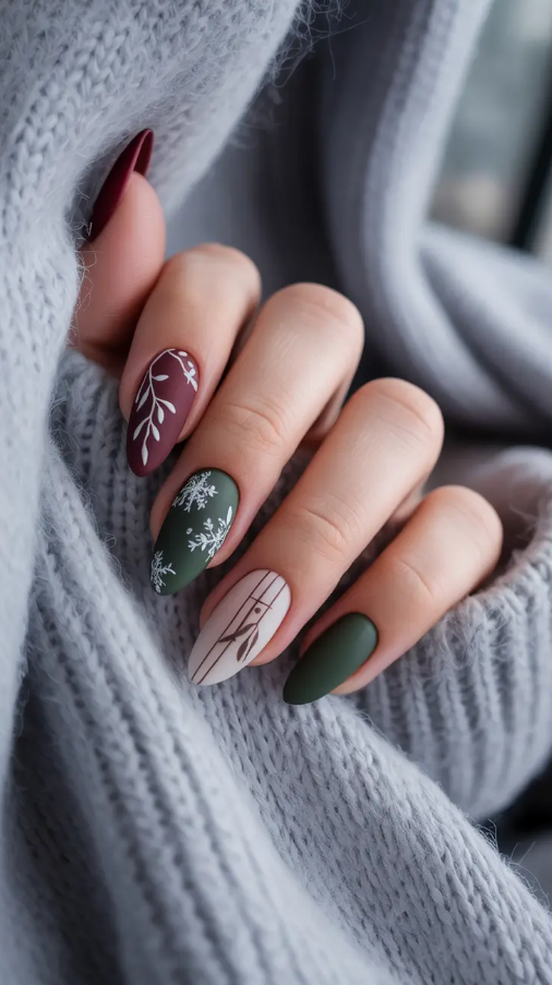 Cozy would appear like this had it were possible to put it in a manicure bottle. The combination of muted forest green, dark maroon, and beige creamy colors is made in a matte finish that is like throwing your hands in a cashmere blanket. The white line art of leaves and snowflakes is fine enough to add the necessary touch of uncertainty and intricacy.