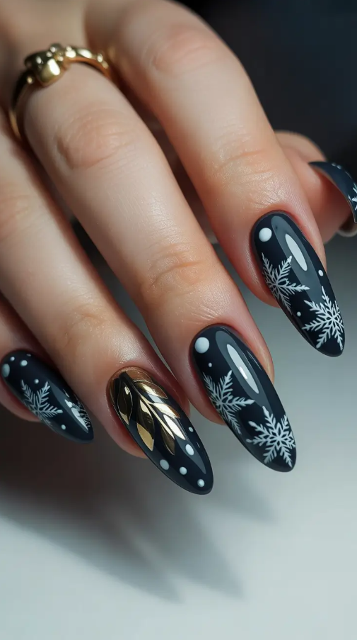 Nothing is as classy as long, gold-and-snowflake deep-navy-black nails when winter evenings get long. This appearance is a blend of matte style and glimpses of metallic-like night sky and star light colliding. It is so solemn and enchanted and I love the way the golden leaf accent draws out the feeling that it is a piece of fine art.
