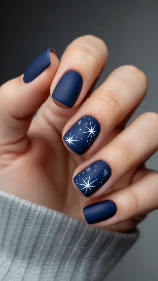 It is a night sky in January, when there is a stillness, a matte navy sky punctured with stars and a dream. Its short, round nails make it easy to wear, and the fine star decorations leave it with the touch of the sky. It is that type of minimalistic design, which seems contemporary and classic at the same time.