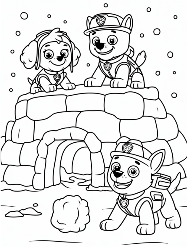 Think winter wonderland, Santa visits, and cozy sweaters. The pups feel right at home in snowy scenes. My crew loves coloring the snow in light blues and purples for a frosty look.