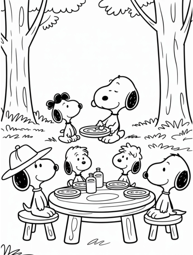These pages lean creative, with patterns on tablecloths, tiny leaves swirling around, and space to add your own doodles. My oldest adds polka dots to Snoopy’s chef hat and stripes to the napkins. It turns a simple printable into a mini art project, and it keeps the kids engaged longer.