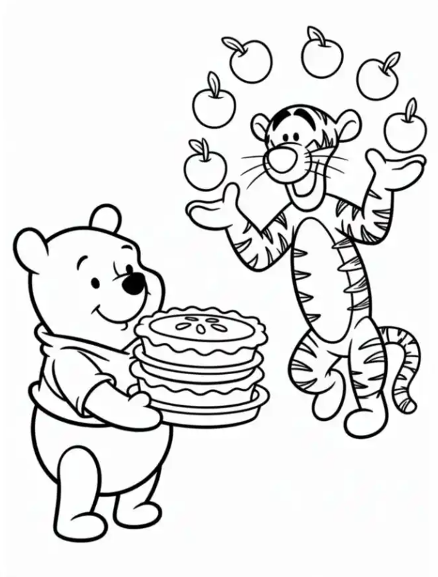 Sometimes the simplest pages get the most love. Pooh with a turkey silhouette, a pie on a checkered table, or a stack of pumpkins is sweet and easy. Fewer details mean faster wins, and that boosts confidence for new artists.