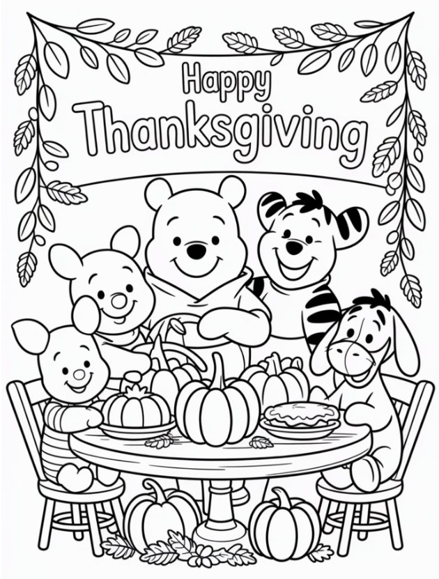 Thanksgiving at our house always begins with crayons on the table — not the turkey. My three kids love to color while I cook, and honestly, it’s the best way to keep everyone happy and busy. Winnie the Pooh Thanksgiving coloring pages are perfect for those slow, cozy mornings — full of honey pots, autumn leaves, and gentle harvest vibes that fit the season perfectly.