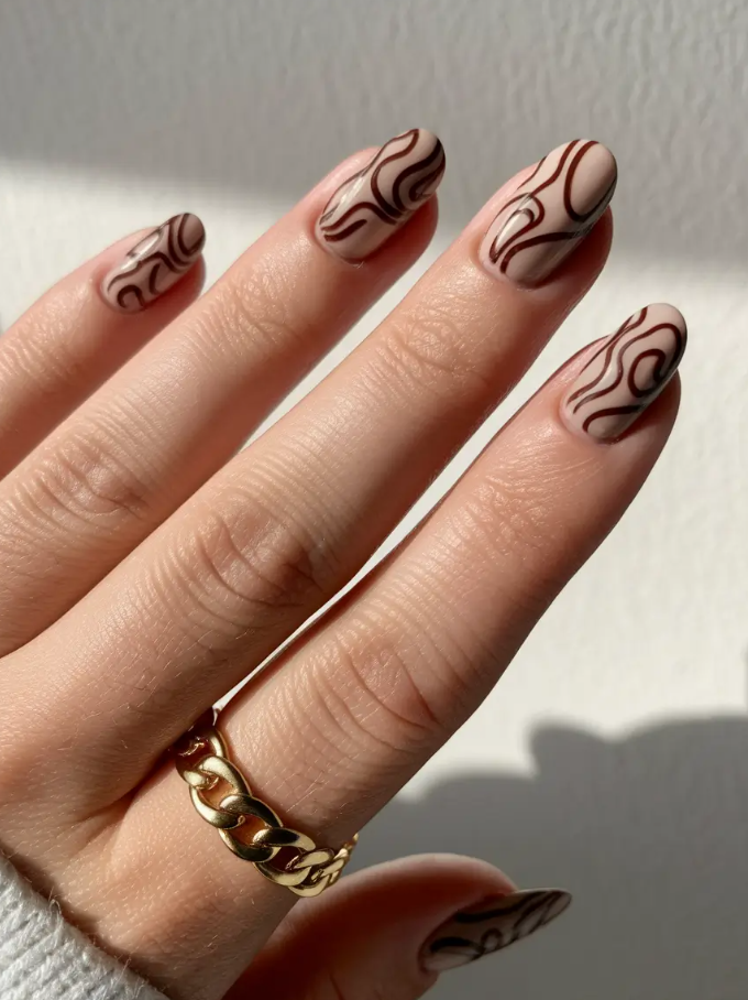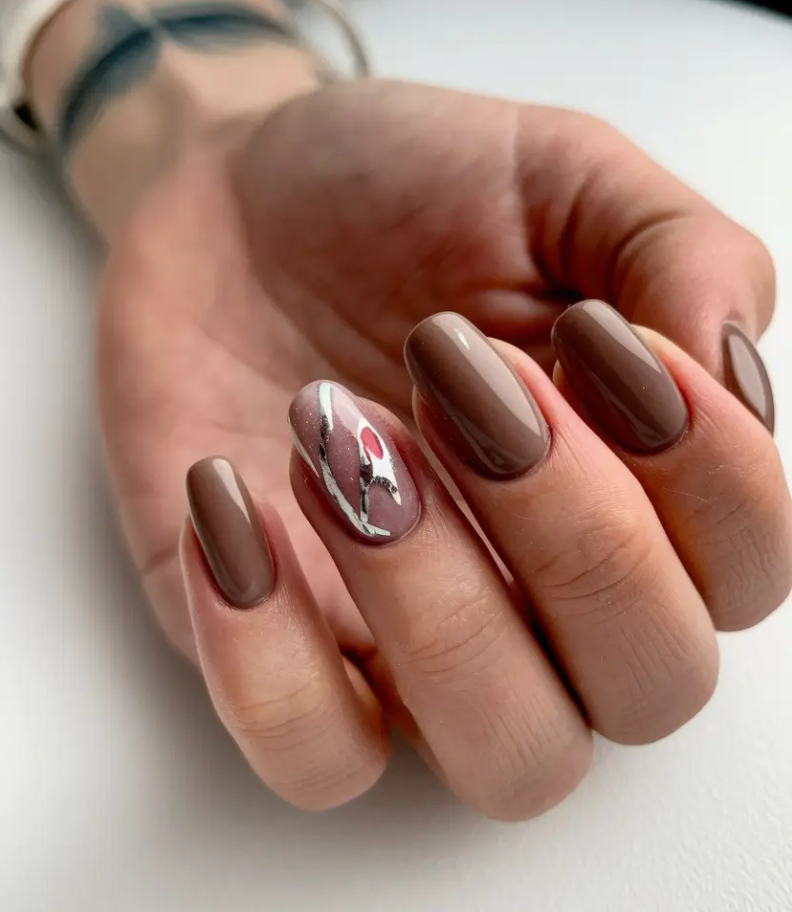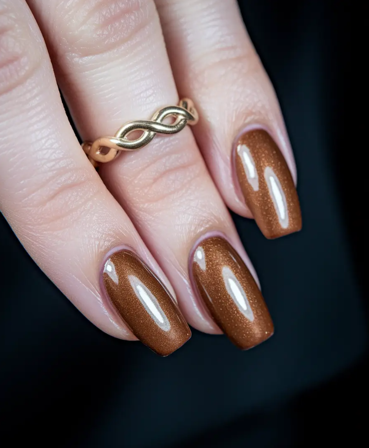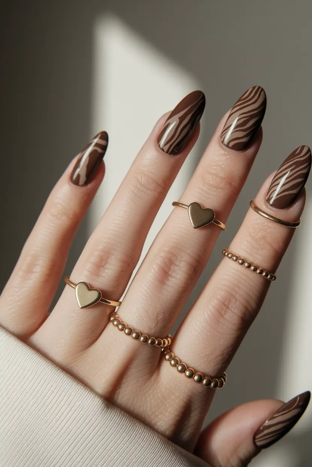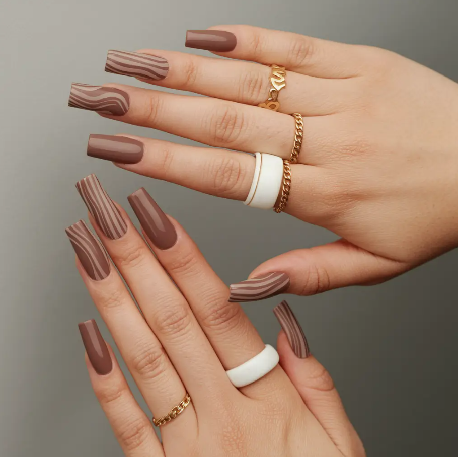 This season, I’ve gathered 2025 inspo that proves brown is anything but boring. In fact, it’s the chicest neutral you can work with. Each design below tells its own story—whether it’s a touch of golden shimmer, abstract artistic flair, or minimal short-square sophistication.
