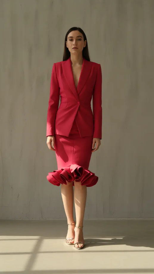 There’s something magnetic about an out-of-place structured suit. This rich crimson ensemble-with its architectural peplum skirt and sleek tailored jacket-has a sense of two things: strength and femininity. It’s one of those Capsule Wardrobe Outfits 2026 pieces you want to walk taller the instant you put it on.