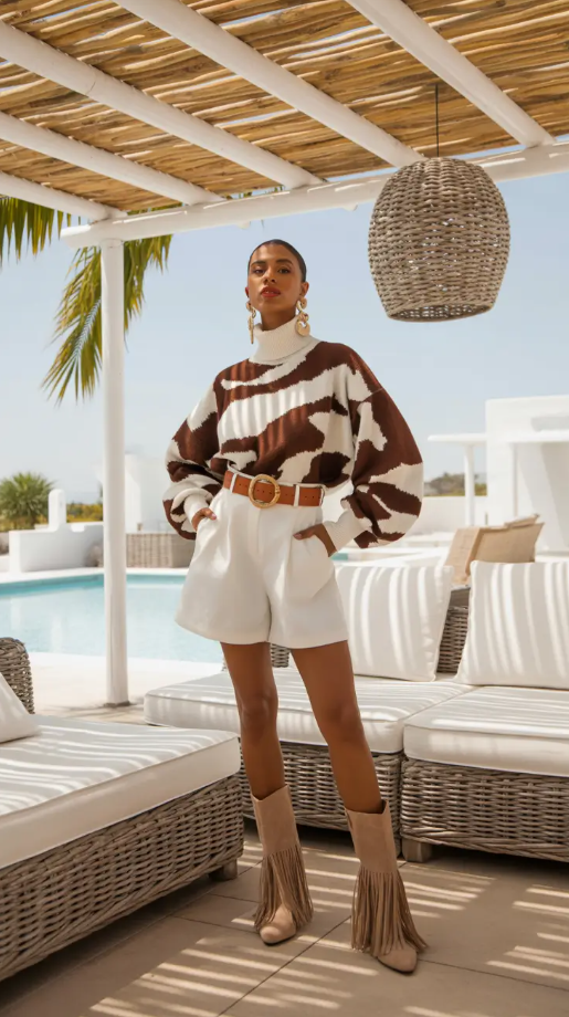There’s something about neutrals that tell a story that’s as irresistible as the neutrals themselves. This brown and cream color sweater with crispy white short seems like an allusion to Soft autumn hues, a cozy, yet solitary sun version ( militants) on Summer mornings or coastal Travel days. The wide belt and fringed boots add texture and warmth to this look, which is what gives it its tactile appeal.